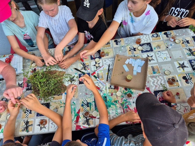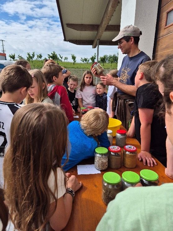 Außerdem konnten wir selbst Thymianhonig herstellen, der uns bei Halsschmerzen helfen kann. Eine weitere Station war die Wildblumenwiese. Dort hat uns Claudia erklärt, welche Pflanzen dort wachsen und wir haben einige Insekten angetroffen.