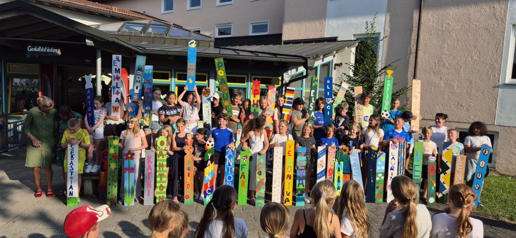 Als wichtiges Ereignis galt auch die Vorstellung der selbst designten Holzlatten der Kinder der Abschlussklassen 4a und 4b. Diese wurden dann stolz an die Lehrkräfte übergeben und erweiterten so die Zaunlandschaft des Schulgeländes.