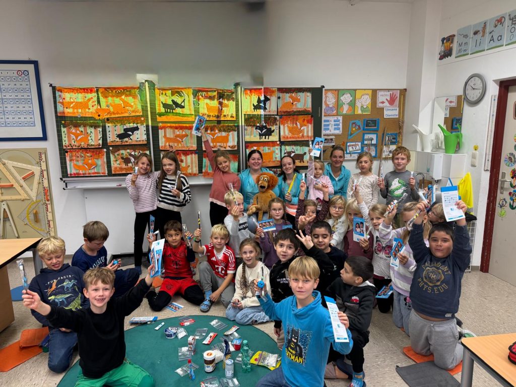 Zum Abschluss erhielt jedes Kind eine kleine Überraschung: eine Zahnbürste, eine Zahnpasta und einen Spitzer. Der Besuch war eine spannende und lehrreiche Erfahrung, die die Kinder motiviert hat, noch besser auf ihre Zähne zu achten.