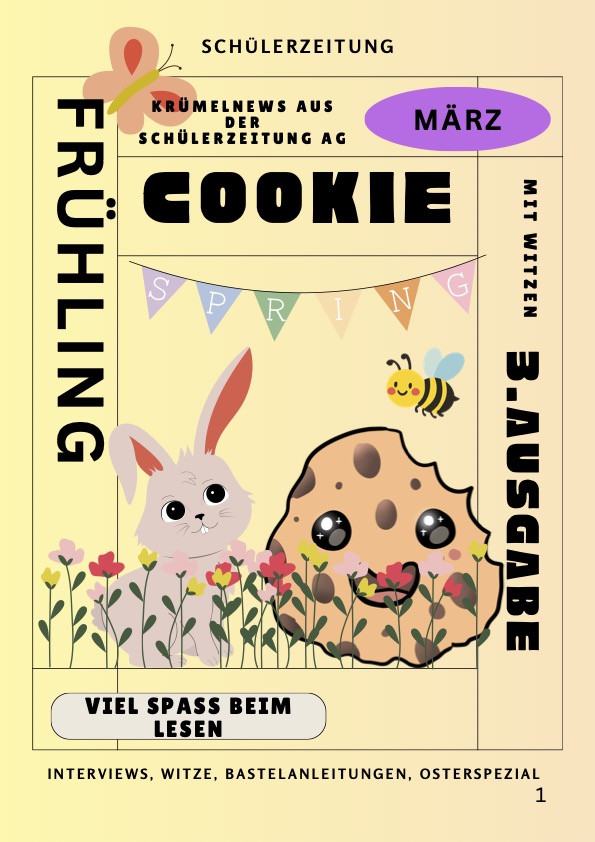 Passend zum Frühling ist eine neue Ausgabe unserer Schülerzeitung „Cookie“ erschienen. Freut euch auf spannende Beiträge rund um Pflanzenkunde, lustige Witze, kreative Gedichte sowie knifflige Rätsel.